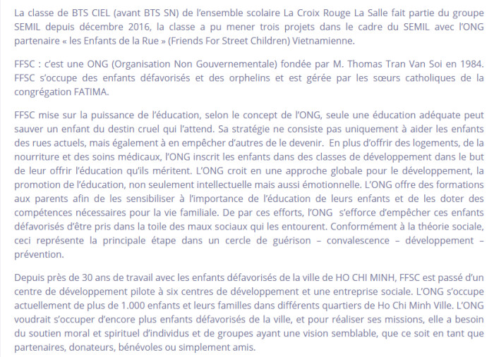 Depuis plusieurs années, votre magasin soutient l'organisation non gouvernementale vietnamienne FFSC (Friends For Street Children) qui vient en aide aux enfants défavorisés et orphelins du Vietnam.